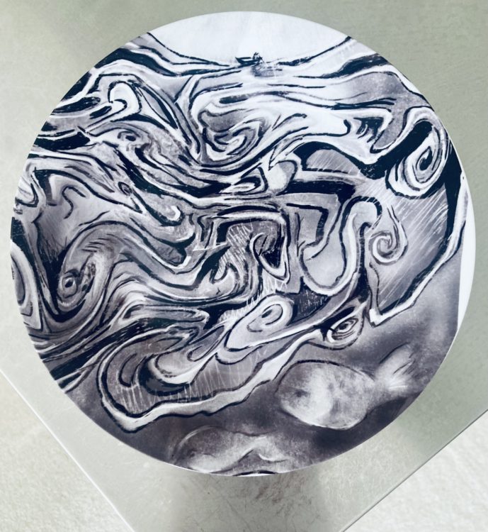 Drijvende inkt is het medium in mijn werk. Suminagashi, een marmertechniek, de inspiratiebron. Het werk belichaamt schoonheid van imperfectie en de veranderlijke natuur van het leven. Papier, glas, textiel en servies zijn drager van de afbeelding.